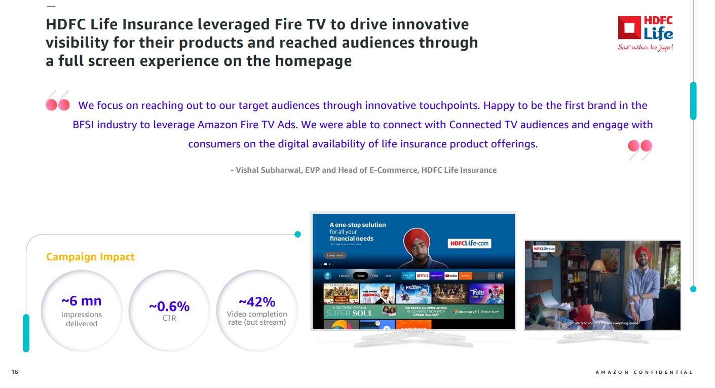 Amazon Fire TV CTV serves video ads during OTT content playback on Connected TVs and smart TV devices. Advertisers select targeting parameters such as geography, content category, device type, and time of day. Campaigns are optimized for reach, frequency, and completion across Indian households.