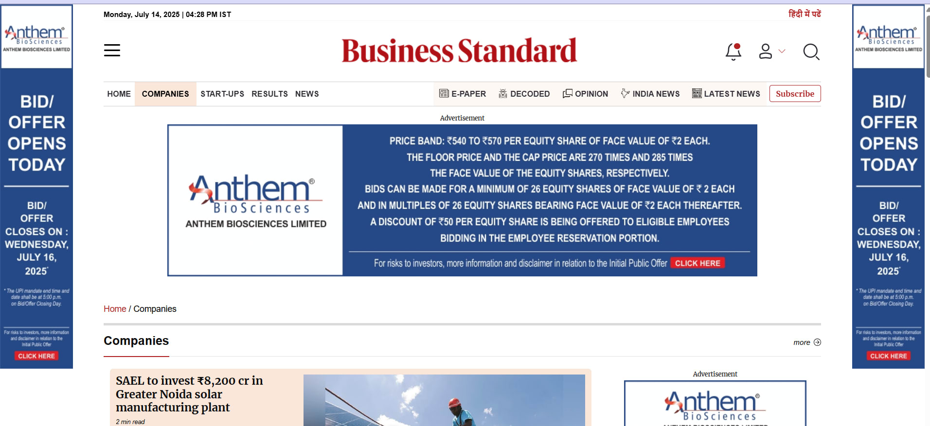 A leading financial news platform, Business Standard provides comprehensive coverage of business, financial markets, politics, and the economy. Catering to a niche audience of business leaders, investors, policymakers, and professionals, Business Standard Website Ads offer brands a credible reputation, brand awareness and build visibility among the right audience.