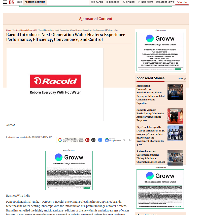 Business Standard Website is a popular digital news platform having over 15000000 and covering latest news in Finance, Economy, and more. Business Standard Ads targets an affluent audience interested in finance and boosts visibility using customer engagement driving repeat sales or while launching new products.