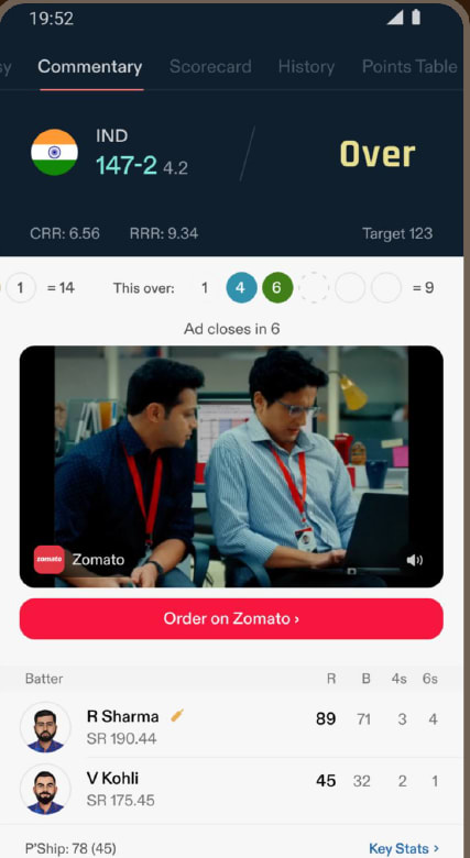 Performance-Optimized Placements: Ads are strategically positioned during high-attention cricket moments—maximizing user engagement and conversion potential.