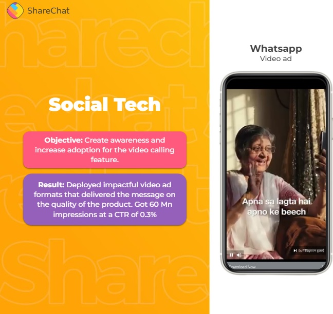ShareChat Ads help reach more people and target consumers using online channels at every sales funnel stage. ShareChat Ads are an innovative way to showcase products/services for brand awareness and boost visibility by engaging customers to drive repeat sales. With 180000000 monthly active users, ShareChat Ads target a large-scale audience using precision retargeting.
