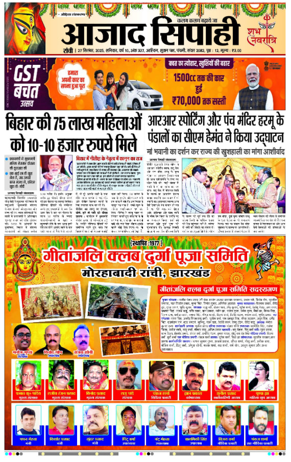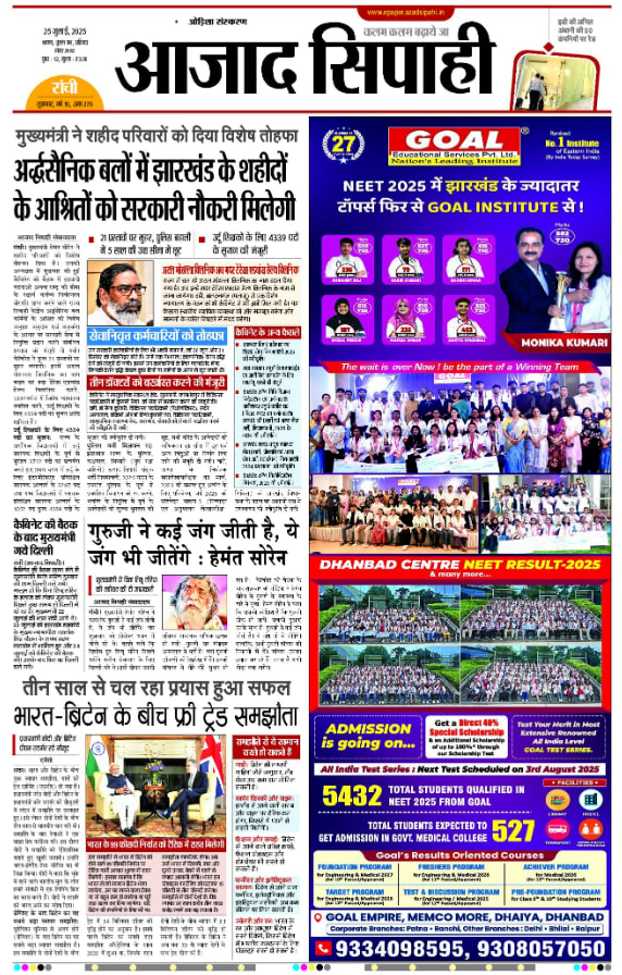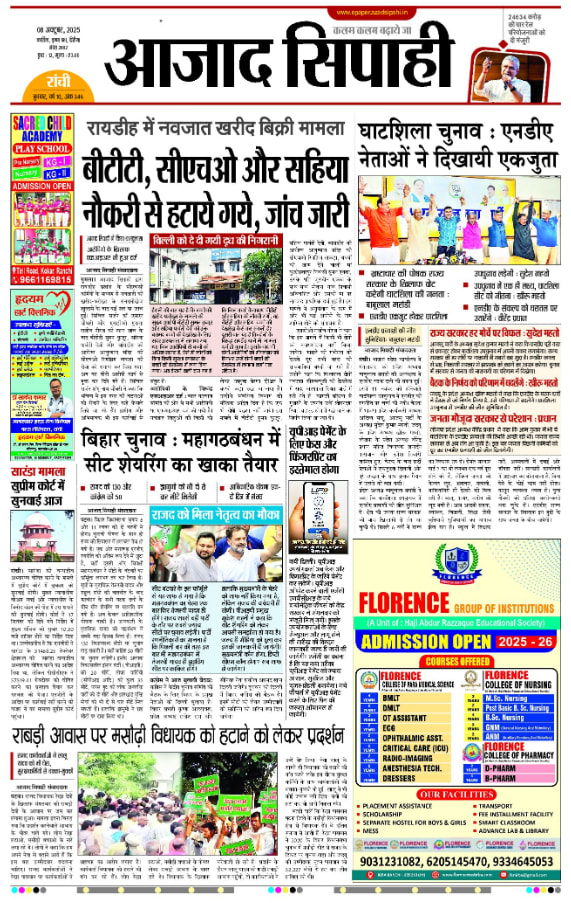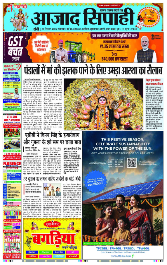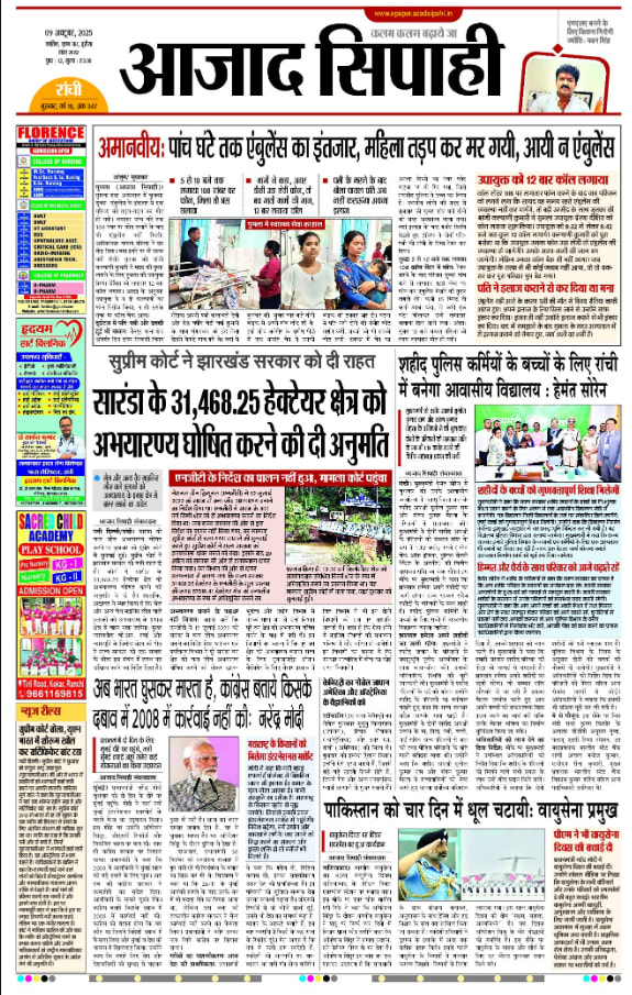 Azad Sipahi, Ranchi, Hindi has a wide range of audiences who are interested in Regional, National, and International News. Azad Sipahi, Ranchi, Hindi is one of the most trusted newspaper brands. Azad Sipahi, Ranchi, Hindi Advertisement will help advertisers to build trust with their audience. Azad Sipahi, Ranchi, Hindi Advertisement will also boost visibility to a city-wide audience and help with brand recall.