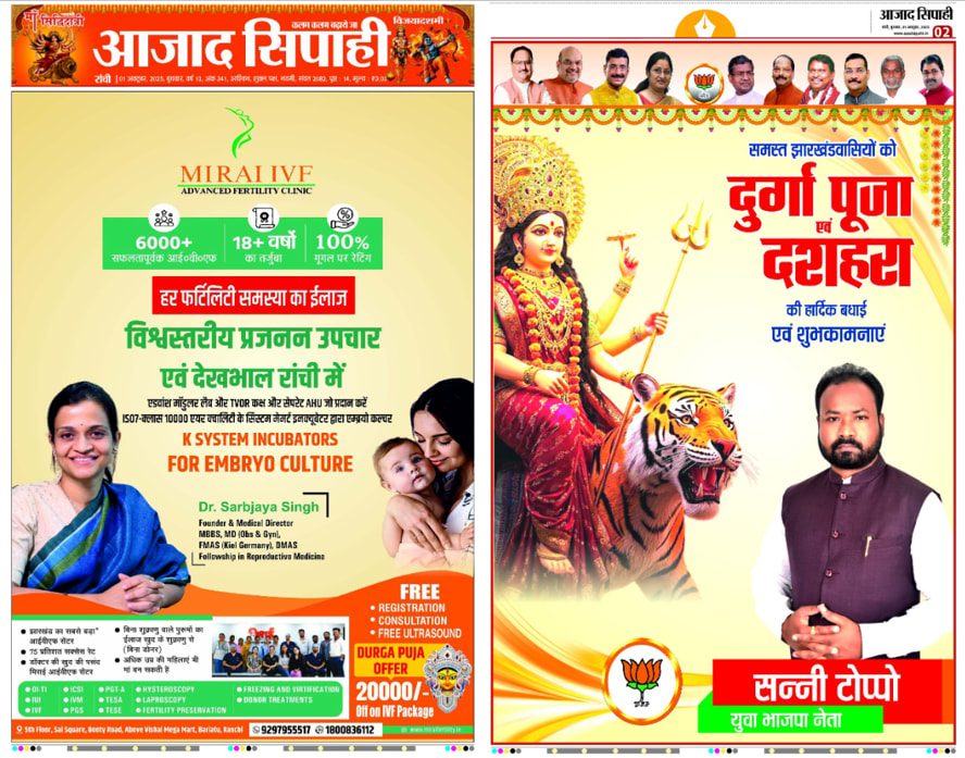 To place your advertisement in Azad Sipahi, Ranchi, Hindi, advertisers must select the size and placement of their ads in the newspaper. Azad Sipahi, Ranchi, Hindi Advertising is customizable and its price will vary depending on the ad requirements.