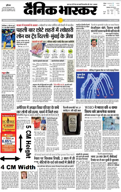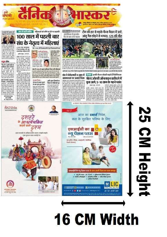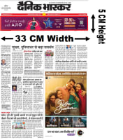 Newspaper ads in Dainik Bhaskar, Punjab, Hindi can vary in size from small classifieds to large full-page spreads. Common sizes include quarter page, half page, and full page, but we can accommodate custom sizes based on your needs.