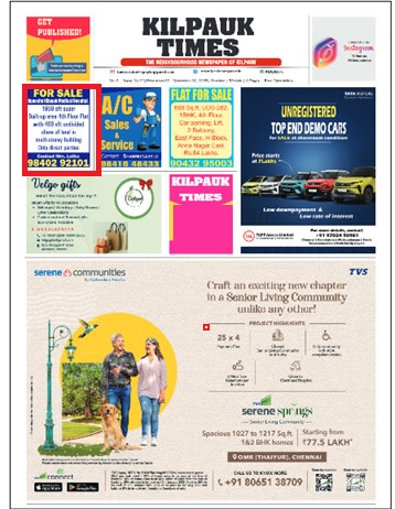 Advertising in Kilpauk Times, Kilpauk, English connects your brand with a dynamic and influential audience, through a trusted and respected publication renowned for its insightful and authoritative content. Whether your goal is to launch a new product, increase brand awareness, or drive direct responses, Kilpauk Times, Kilpauk, English offers a platform tailored to meet your advertising needs.