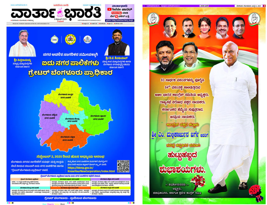Vartha Bharati, Mangalore, Kannada Newspaper is one of the most reliable newspapers in the city, making it a trustworthy platform to place your newspaper advertisement. Newspaper Ads are customizable and can be chosen by the advertisers based on their ad creatives and the impact they would like to create.