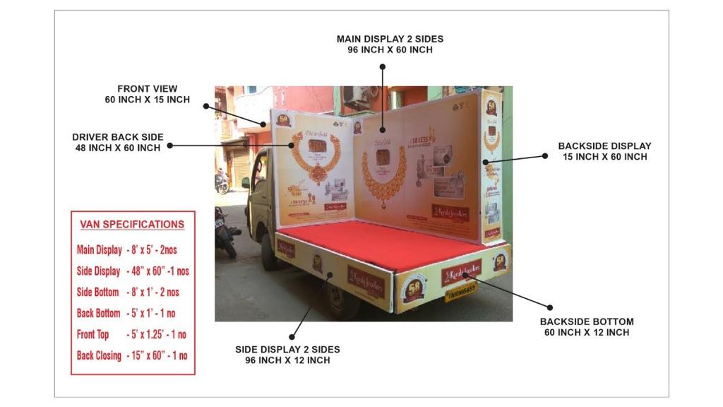 Mobile Van Hoarding Ads are creative display ads with non lit. These Mobile Van Ads are carried by the van, which runs for approx. 8 hours per day and it will cover approx. 40 km/ day. The van is not allowed to stop in high traffic areas. Permission chages will be extra.