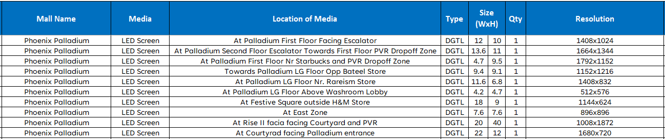 You can book ads on a package of 10 digital screens, located inside the mall. The Digital wall are strategically placed at key locations, including 1st Floor Facing Escalator, 2nd Floor Escalator Towards 1st Floor PVR Dropoff Zone, 1st Floor Nr Starbucks and PVR Dropoff Zone, Towards Palladium LG Floor Opp Bateel Store, LG Floor Nr. Rareism Store, LG Floor Above Washroom Lobby, At Festive Square outside H&M Store, At East Zone, At Rise II facia facing Courtyard and PVR, At Courtyrad facing Palladium entrance at various location of the mall. Each ad is displayed for 20 seconds in a 6-minute loop, with each screen showing your ad approximately 120 times daily. The screens operate from 11 AM to 10 PM, ensuring maximum visibility to mall visitors throughout the day.