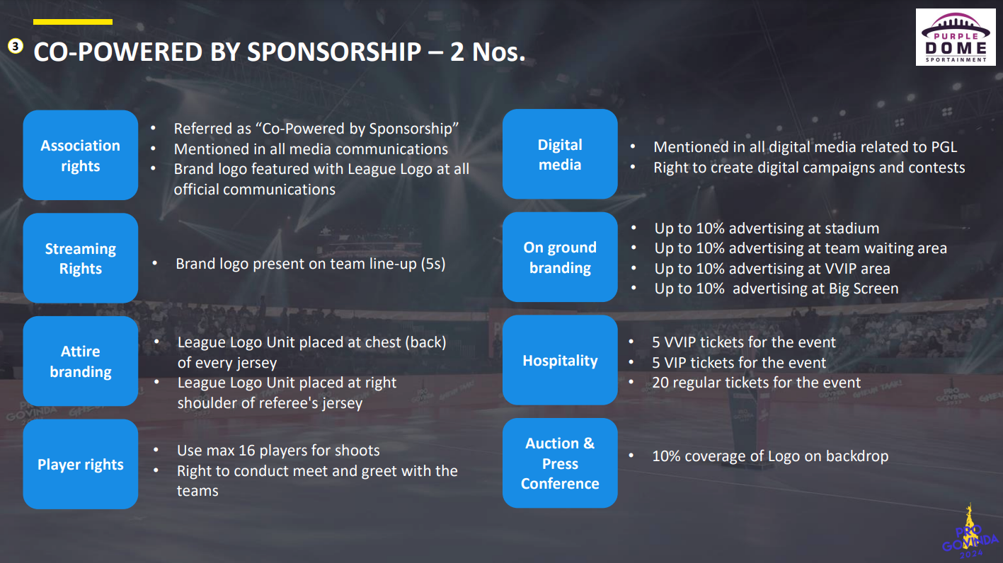 As the Co-Powered by Sponsor, the brand will be mentioned in all media communications, with the logo featured alongside the League Logo in official communications and on team line-ups (5s). The League Logo Unit will be placed on the chest (back) of every jersey and the right shoulder of referees' jerseys. The brand can use up to 16 players for shoots, conduct meet-and-greet events with teams, and create digital campaigns. The package includes up to 10% advertising in the stadium, team waiting area, VVIP area, and on the big screen, along with 5 VVIP, 5 VIP, and 20 regular tickets, and 10% logo coverage on the backdrop.
