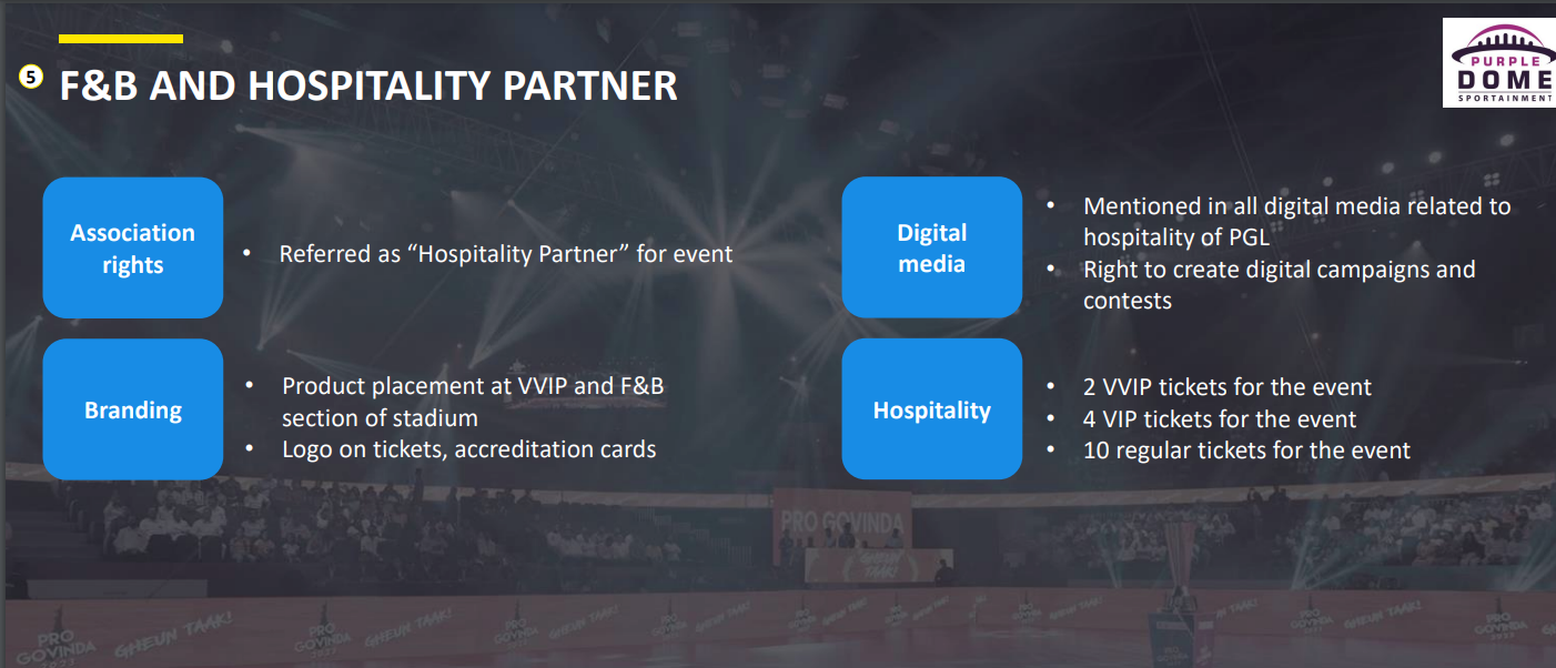 As the Hospitality Partner for the event, the brand will have product placement in the VVIP and F&B sections of the stadium, with the logo featured on tickets and accreditation cards. The brand will be mentioned in all digital media related to the hospitality of PGL. The partnership includes the right to create digital campaigns and contests. The package provides 2 VVIP, 4 VIP, and 10 regular tickets for the event, offering exclusive access and enhanced visibility through strategic placement and branding in key areas of the event.